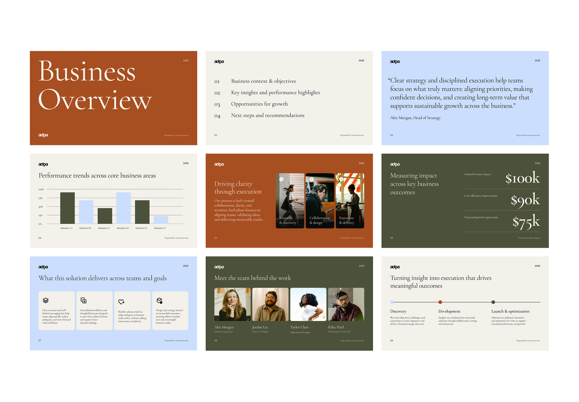 Business presentations often struggle to keep audiences engaged, especially when the material is complex. The challenge was to create a system that makes information easy to absorb by blending structure, a sense of calm, and genuine engagement, all while keeping the design simple and highly functional.
